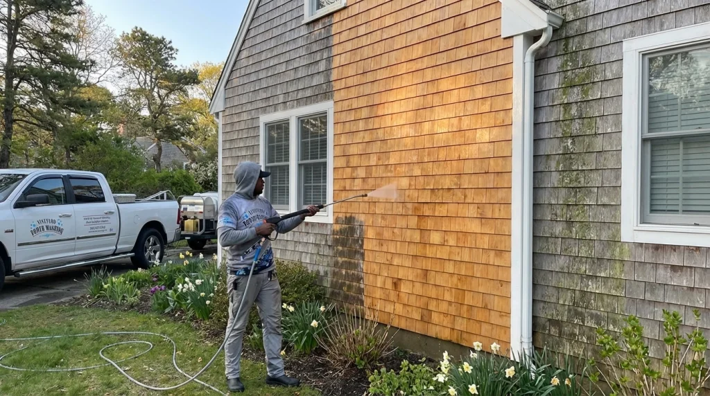 Siding and house exterior. The house washing service is the highest-impact single cleaning for curb appeal. Soft-wash house washing removes the winter’s worth of salt haze, algae, and biological growth from the siding and shingles without forcing water behind materials or damaging painted surfaces. After a Martha’s Vineyard winter, almost every exterior surface benefits from it.