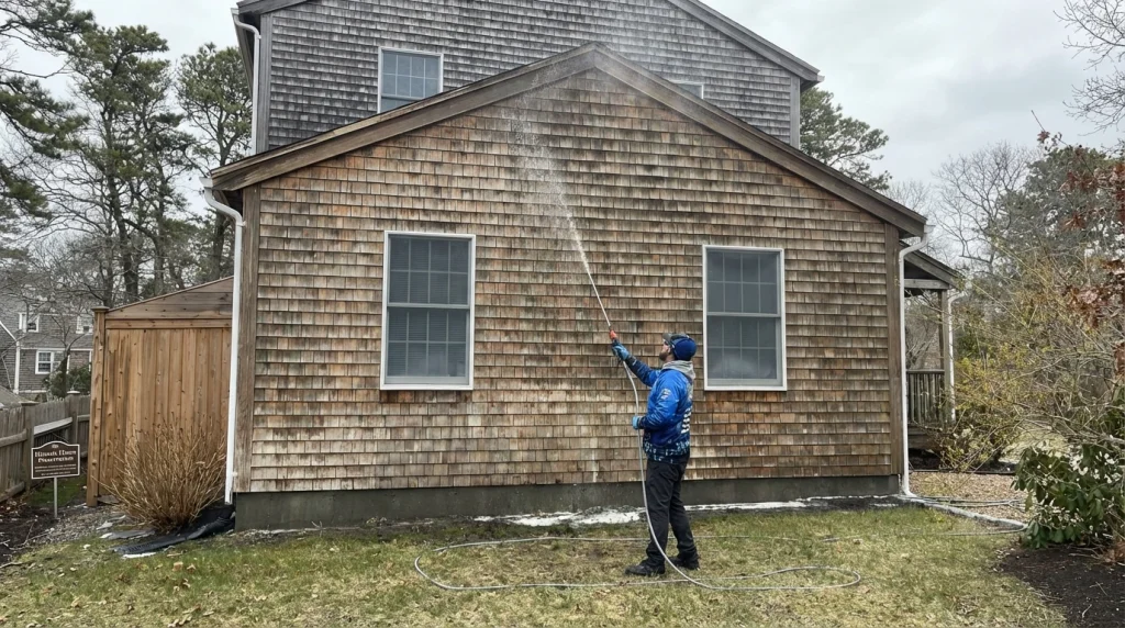 Yes. Soft washing uses low-pressure application with biodegradable solutions that clean the surface and kill biological growth without forcing water into shingle joints. It’s actually safer than high-pressure washing in spring, because high pressure can drive moisture behind wet shingles and create internal mold problems that are much harder to fix later. Vineyard Power Washing has used soft-wash techniques on cedar shingles for decades, it’s the only method we recommend for island homes.